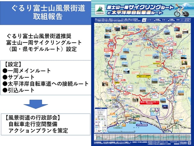 富士山一周サイクリング(フジイチ)ルートとナショナルサイクルルート(NCR)の「太平洋岸自転車道」と接続するための接続ルート(静岡県側)について、静岡県側の行政部会で検討し、フジイチルートの自転車走行空間整備と同等の整備を行うことになった。